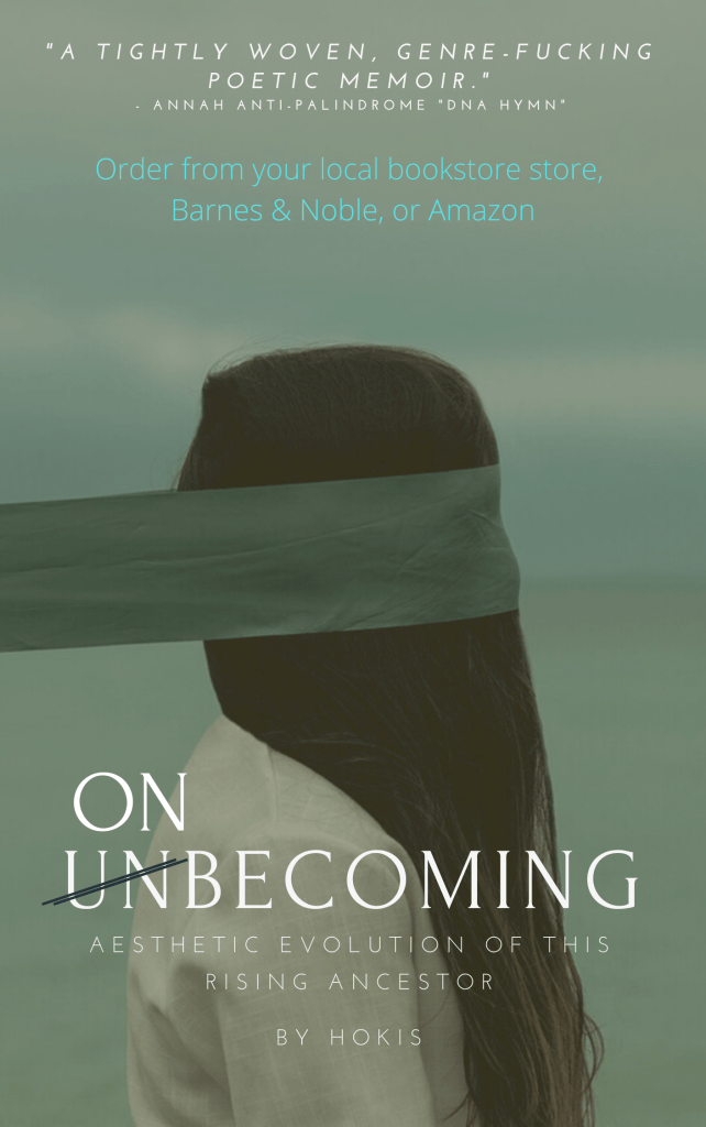 In On Un Becoming, aesthetic evolution of this rising ancestor, a poetic memoir, the first thing you’ll be drawn to is the impeccably beautiful cover and layout. This is high art with poetry. Beyond the obvious beauty, Hokis has laid down the tracks of her life thus far in an exquisitely honest rendering.